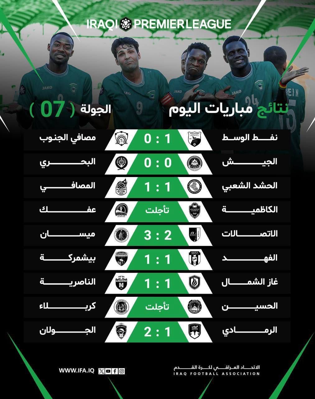 شهدت الجولة السابعة من الدوري العراقي الممتاز لكرة القدم اليوم السبت منافسات مثيرة حيث تفوّق ميسان على الاتصالات بثلاثة أهداف مقابل هدفين