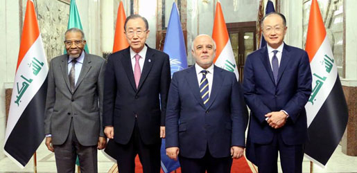 وقال العبادي في مؤتمر صحافي مشترك مع الأمين الامم المتحدة بان كي مون ورئيس البنك الدولي جيم يونغ كيم ورئيس البنك الإسلامي أحمد محمد علي إن "الأمين العام للامم المتحدة ورئيسي البنكين الدولي والاسلامي جاءوا لمساعدة العراق في سعيه للاصلاحات و وفي محاربة تنظيم داعش".