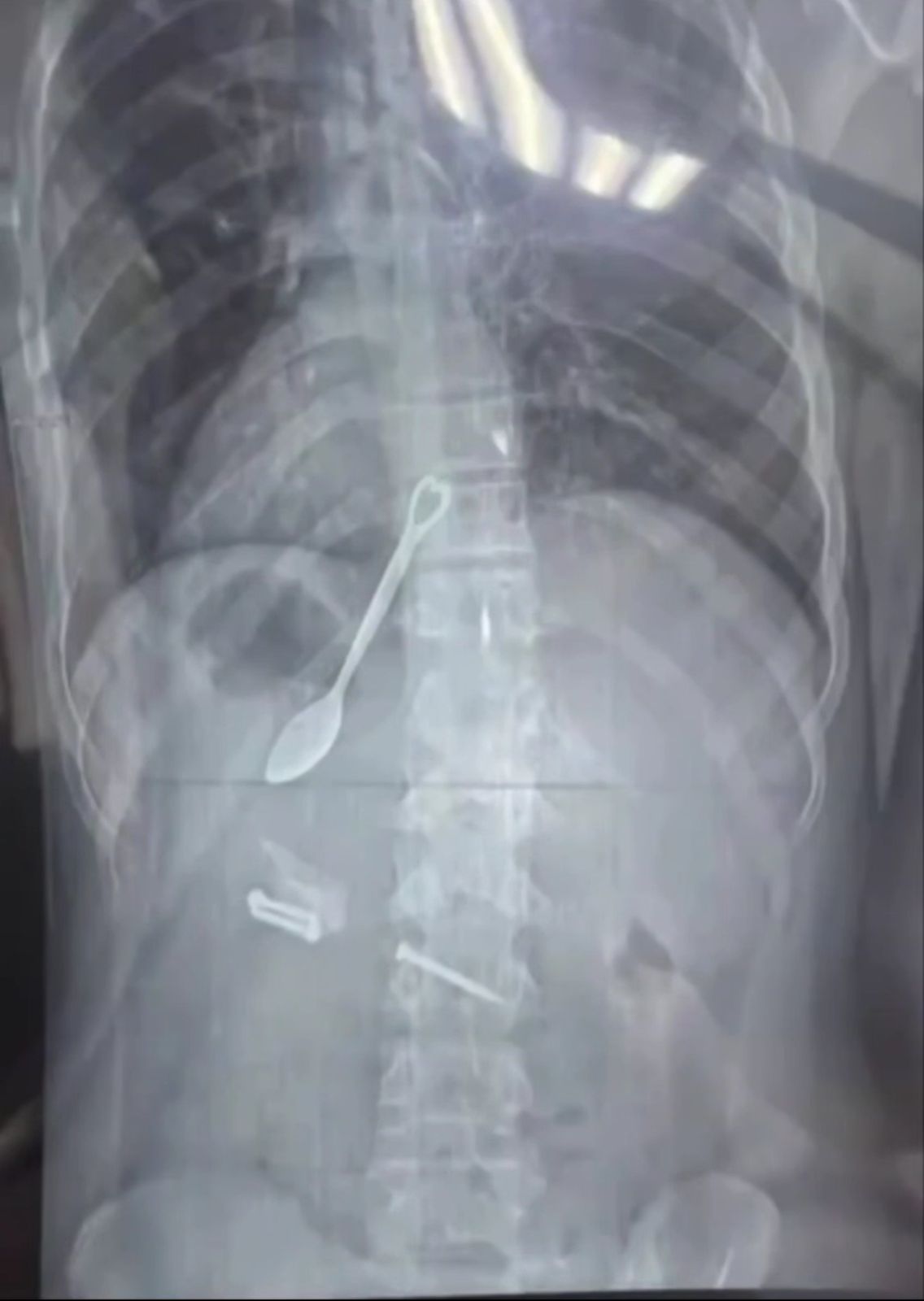 بعد الفحوصات الطبية الأولية تبين أن الملعقة كانت عالقة في منطقة المريء مما استدعى التدخل الطبي السريع