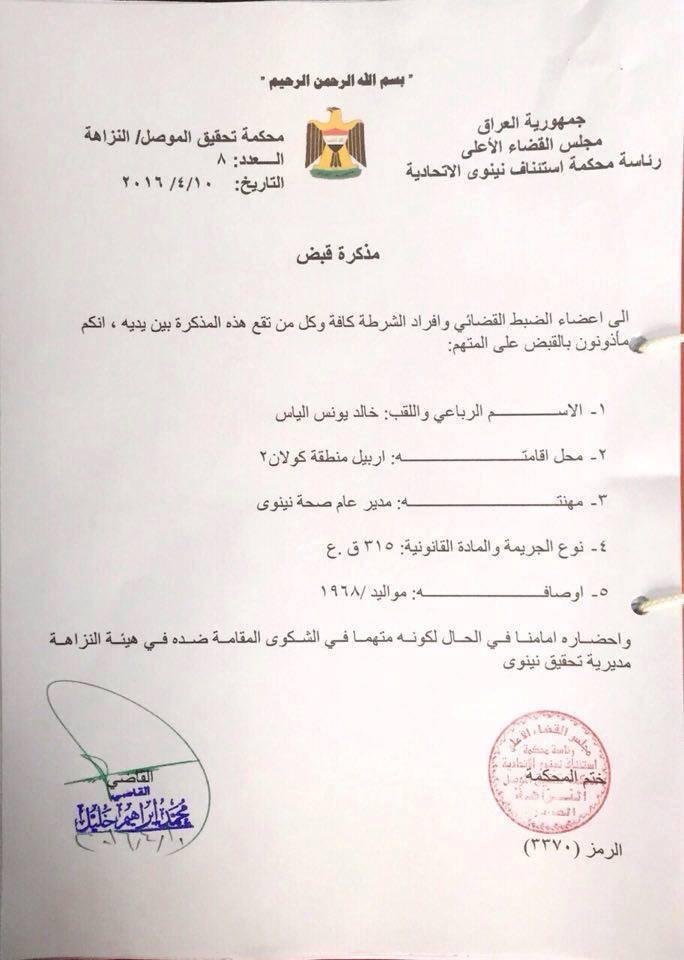 اصدرت رئاسة محكمة استئناف نينوى مذكرة القاء قبض بحق خالد يونس الياس مدير عام دائرة صحة نينوى على خلفية اختفاء رواتب موظفي صحة نينوى من النازحين ،