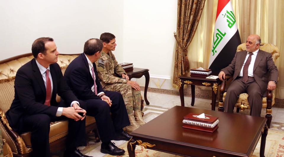 جاء ذلك خلال استقبال رئيس الوزراء حيدر العبادي لقائد القيادة المركزية للجيش الاميركي الجنرال جوزيف فوتل حيث جرى خلال اللقاء بحث الانتصارات المتحققة على تنظيم داعش والاستعدادات لتحرير بقية المناطق ومعركة الفلوجة والموصل وجدد الجنرال فوتل موقف بلاده الداعم للعراق في حربه ضد الارهاب حتى استعادة المناطق كافة .