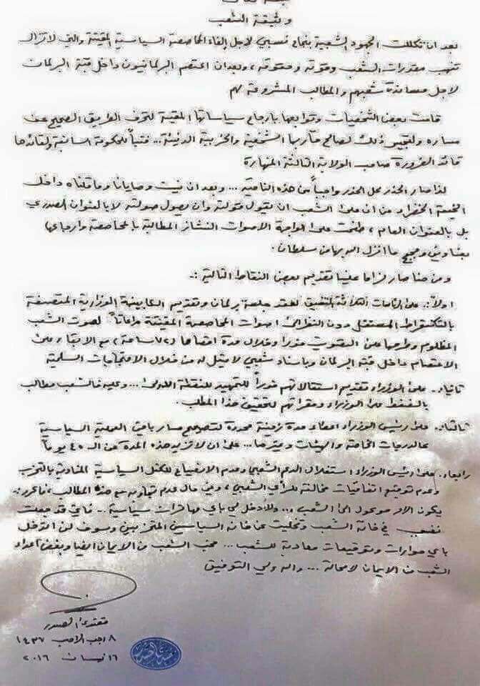 الصدر وفي بيان له طالب الوزراء بتقديم استقالتهم داعيا في كلمة وجهها الى الشعب رئيس الوزراء حيدر العبادي إلى تصحيح مسار العملية السياسية وتقديم الكابينة الوزارية من التكنوقراط والتصويت على الكابينة الوزارية خلال مدة اقصاها 72 ساعة ،وبين الصدر ان المدة امام العبادي لاتتجاوز 45 يوما لتغيير الهيئات المستقلة والدرجات الخاصة واكد الصدر في كلمته ان المحاصصة ما تزال تنهب مقدرات الشعب وقوته وحقوقه كما دعا الصدر باحتجاجات عارمة امام الوزارات للضغط على الوزراء.