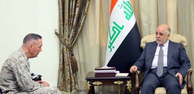 وقال مكتب العبادي في بيان إن الأخير "استقبل، اليوم، رئيس هيئة الاركان المشتركة الاميركية الجنرال جوزيف دنفورد والوفد المرافق له"، مبيناً أنه "جرى خلال الاجتماع بحث تعزيز التعاون العسكري بين البلدين في مجالات التدريب والتسليح والضربات الجوية وأهمية استمرار زخم المعارك لتحرير بقية المناطق".