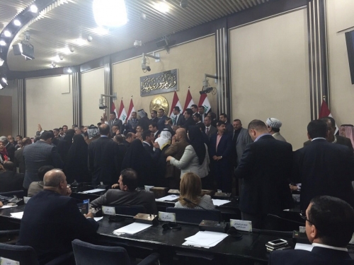 كما حاول عدد من النواب المعترضين عرقلة قراءة العبادي لمشروع الكابينة الوزارية الجديدة، بعد رميه بقناني مياه.