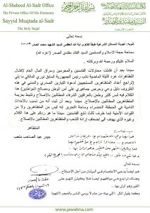 واكد السيد الصدر في جواب على سؤال من أحد انصاره ان المالكي يدعي الاعتصام في البرلمان من اجل الاصلاح وتراجع في موقفه وعليه ان لا يكيل التهم الى غير وهو اولى بها قائلا ما نصه الي بيته من جام لا يرمي الناس بالحجر وكان المالكي قد وصف في تغريده على تويتر ان تراجع اعداد المتظاهرين المستجيبين لدعوة التيارين الصدري والمدني في هذه الظروف دليل وعي وحرص جماهيري على امن الوطن ومصالح المواطنين.