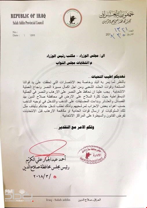 طالب مجلس محافظة صلاح الدين، رئيس الوزراء حيدر العبادي، بأرسال قوات مكافحة الإرهاب الى المحافظة، قبل الانتخابات لفرض القانون والسيطرة على المراكز الانتخابية.