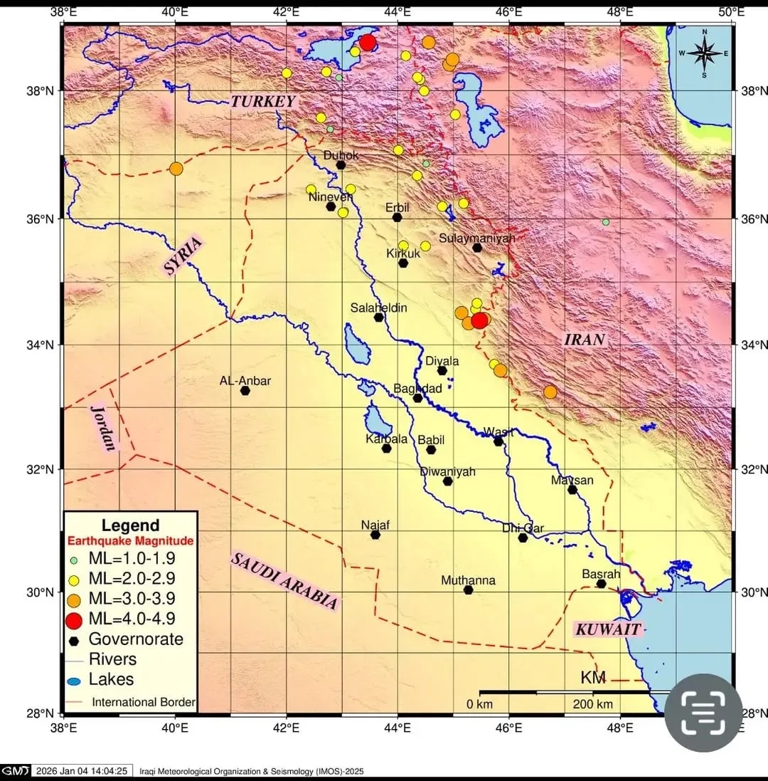 أصدر قسم الرصد الزلزالي في الهيئة العامة للأنواء الجوية العراقية، يوم الأحد، تقريره الشهري الخاص بالنشرة الزلزالية وخارطة النشاط الزلزالي في العراق والمناطق المجاورة لشهر كانون الأول/ ديسمبر 2025.